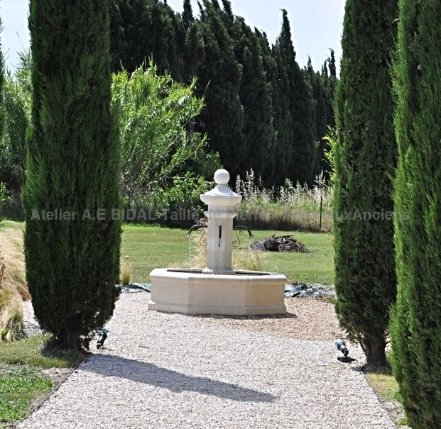 Here are some examples of our latest stone works installed in our beautiful region of Provence : square molded basin with central ball watering in the Var, large round fountain with base installed in Gordes, elegant Provencal fountain in Avy stone surrounded by cypress, octagonal fountain ordered for a campsite located not far from Isle sur la Sorgue or round village fountain for a hotel group of the region ...